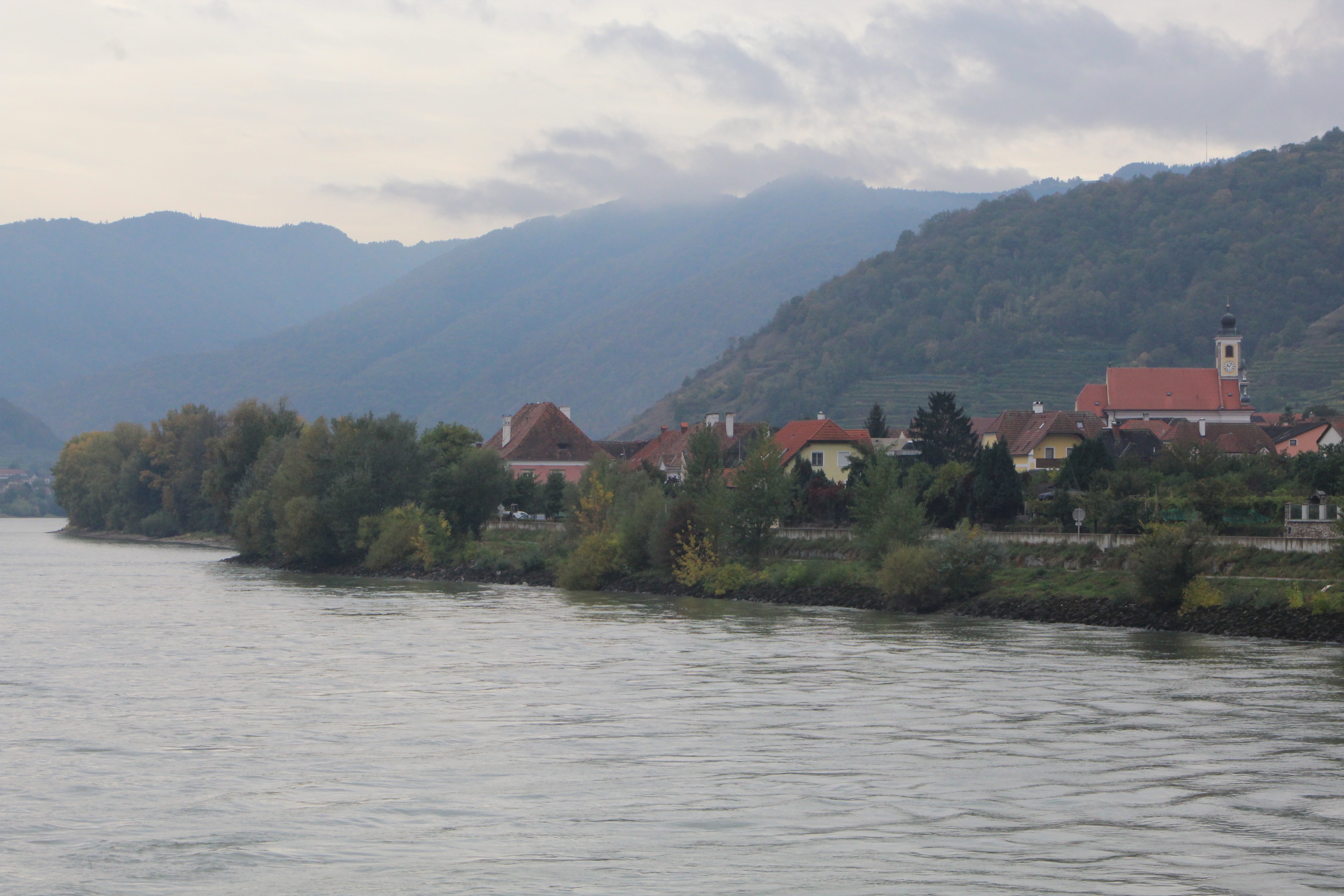 We begin the morning sailing through the Wachau valley. This is the wine growing region of Austria. The slopes and terraces are filled with grape vines, hamlets, and castles. The day is misty so the fog rolling over the mountains just made views even more mystical. The leaves are beginning to change color so the grays of the mist plus the reds, golds and yellows of the trees with the ever present green of the Danube make our morning “at sea” unforgettable.